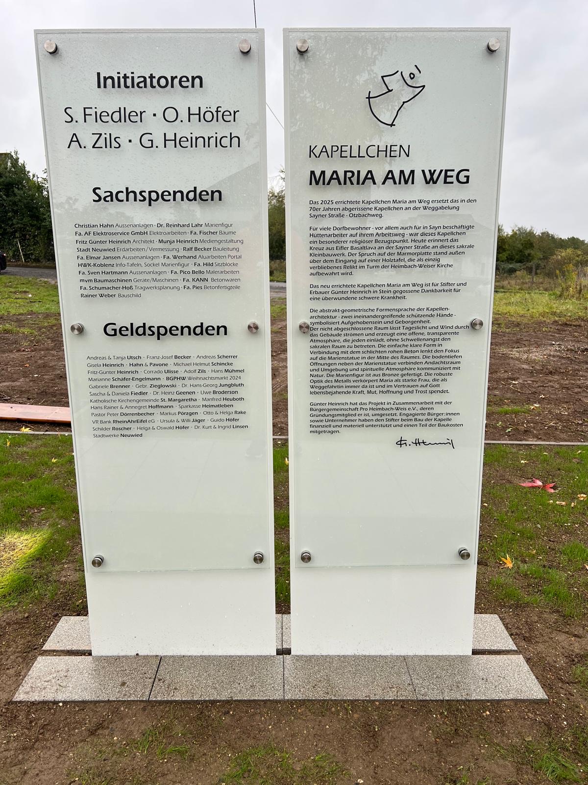 Die ursprüngliche Inschrift auf einer Marmortafel ist im Turm der Heimbacher Kirche erhalten geblieben. Ein Ort der Dankbarkeit gestiftet und erbaut von Architekt Günter Heinrich, ist das Kapellchen ein sichtbares Zeichen tiefer Da gestiftet für die Überwindung einer schweren Krankheit - eine in Stein gegossene Dankbarkeit. Architektur und Symbolik. Die abstrakt-geometrische Formensprache des Gebäudes erinnert an zwei ineinandergreifende Hände - ein Bild für Schutz, Geborgenheit und Aufgehoben sein. Das offen aufgehobene Tageslicht und Wind einströmen und schafft eine transparente, einladende Atmosphäre. Jeder ist eingeladen, ohne Schwellenlast den sakralen Raum zu betreten. Die schlichte Form und der rohe Beton lenken den Blick bewusst auf die Marienstatue in der Mitte. Maria als Wegbegleiterin. Die Marienfigur ist aus Bronze gefertigt. Die robuste, lebendige Oberfläche des Metalls zeigt Maria als starke Frau und Weggefährtin - eine Gestalt, die Vertrauen auf Gott, Mut, Hoffnung und Trost verkörpert. Bodentiefe Öffnungen neben der Statue verbinden den Andachtsraum mit der Umgebung und lassen eine spirituelle Atmosphäre entstehen, die Natur und Gebet miteinander verknüpft. Ein gemeinsames Werk Das Projekt wurde von Günter Heinrich in Zusammenarbeit mit der Bürgergemeinschaft Pro Heimbach-Weis e.V. umgesetzt. Engagierte Bürgerinnen und Bürger sowie Unternehmer haben den Bau finanziell und materiell unterstützt und damit ein Stück Baugeschichte mitgetragen. Dank Allen, die durch ihr Mitwirken und ihre Großzügigkeit zum Gelingen beigetragen haben, sei herzlich gedankt. So ist ein Ort entstanden, der Hoffnung schenkt, Trost gibt und Menschen auf Ihrem Lebensweg begleitet.