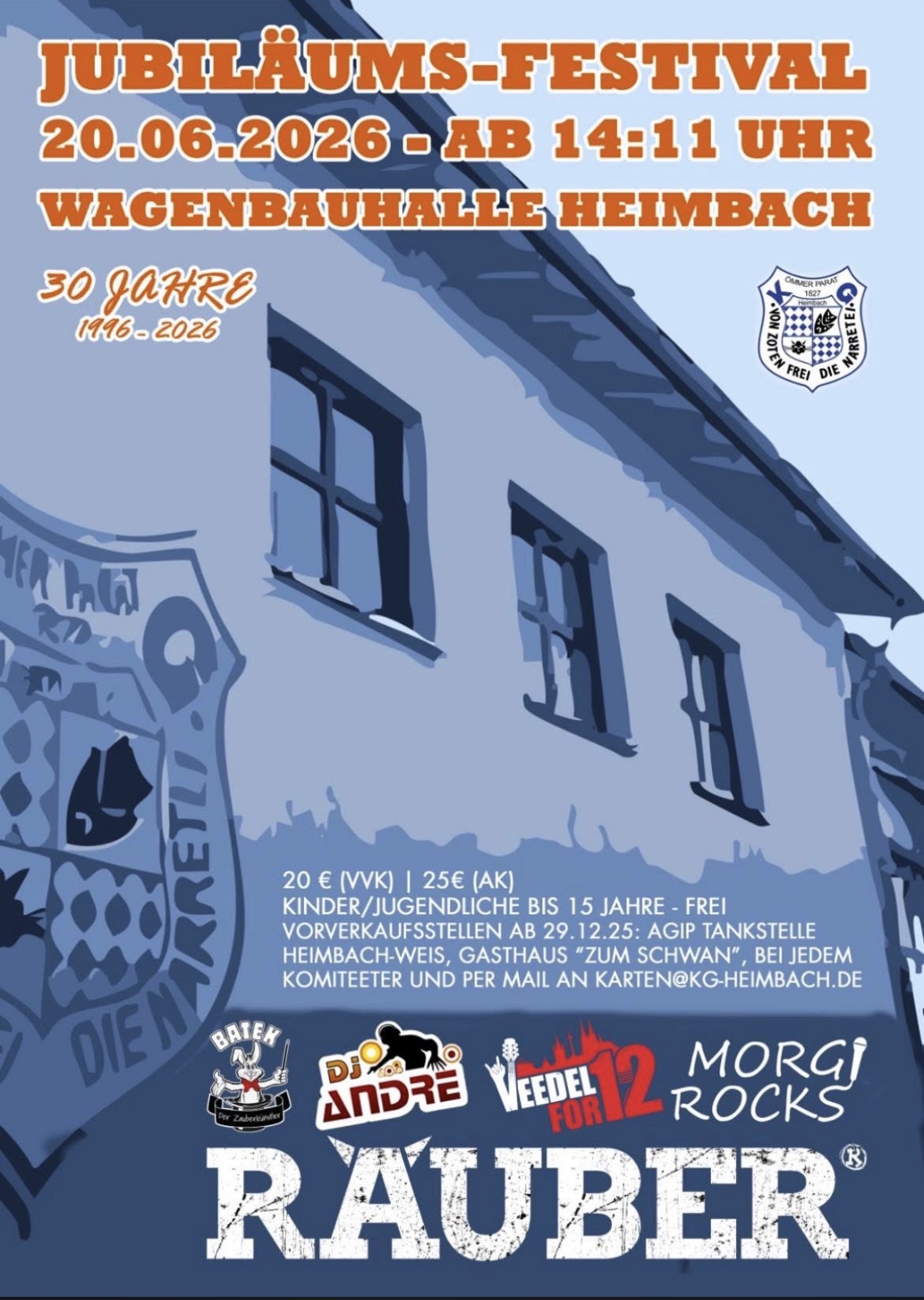Die KG Heimbach lädt ein zum großen Jubiläumsfestival anlässlich 30 Jahre Wagenbauhalle Heimbach – dort, wo 1996 alles begann und wo seit drei Jahrzehnten Fassenacht, Gemeinschaft und gute Laune zu Hause sind.